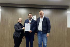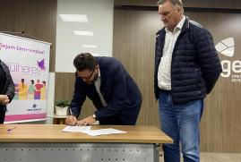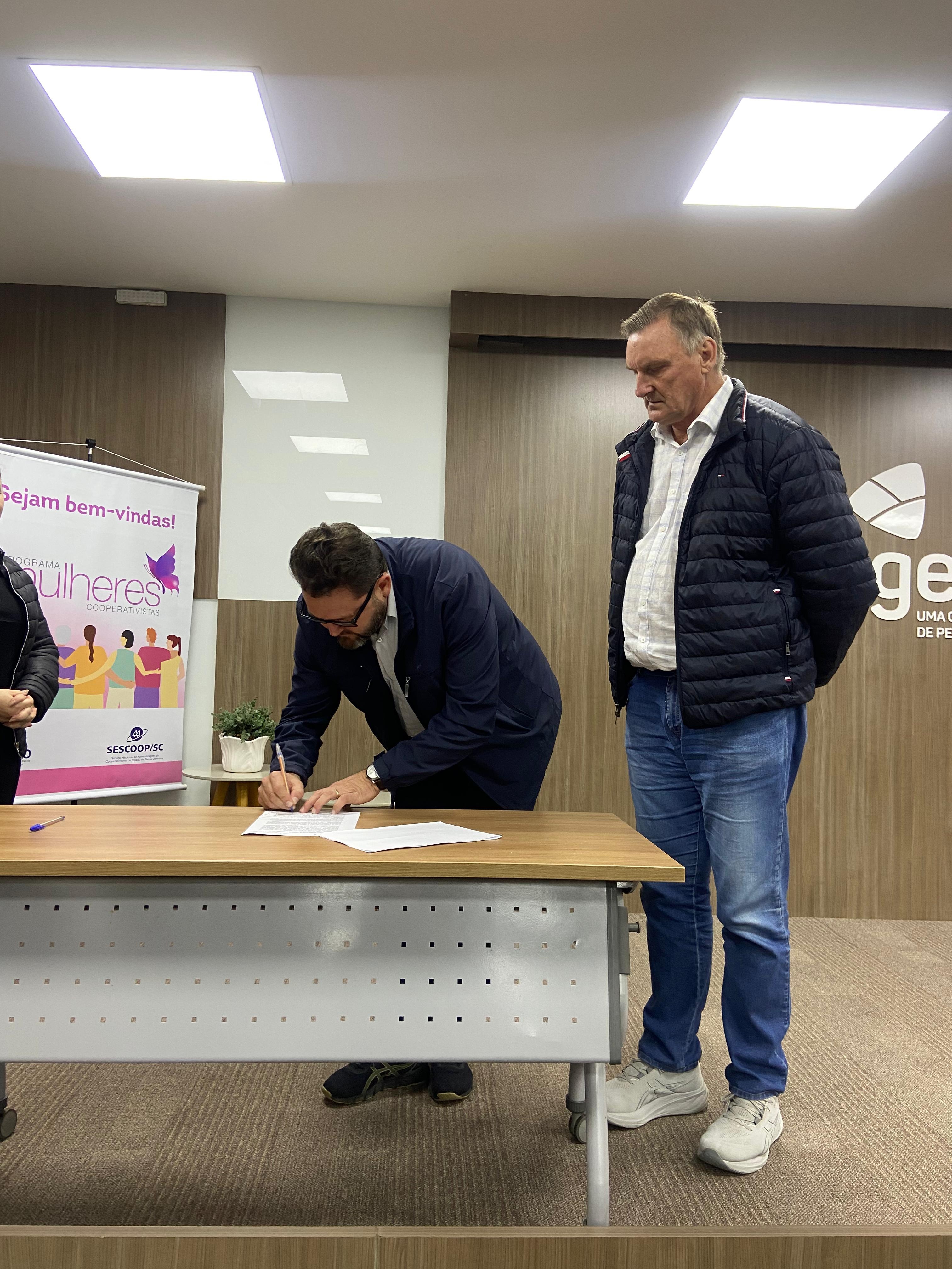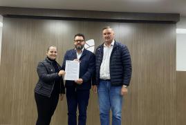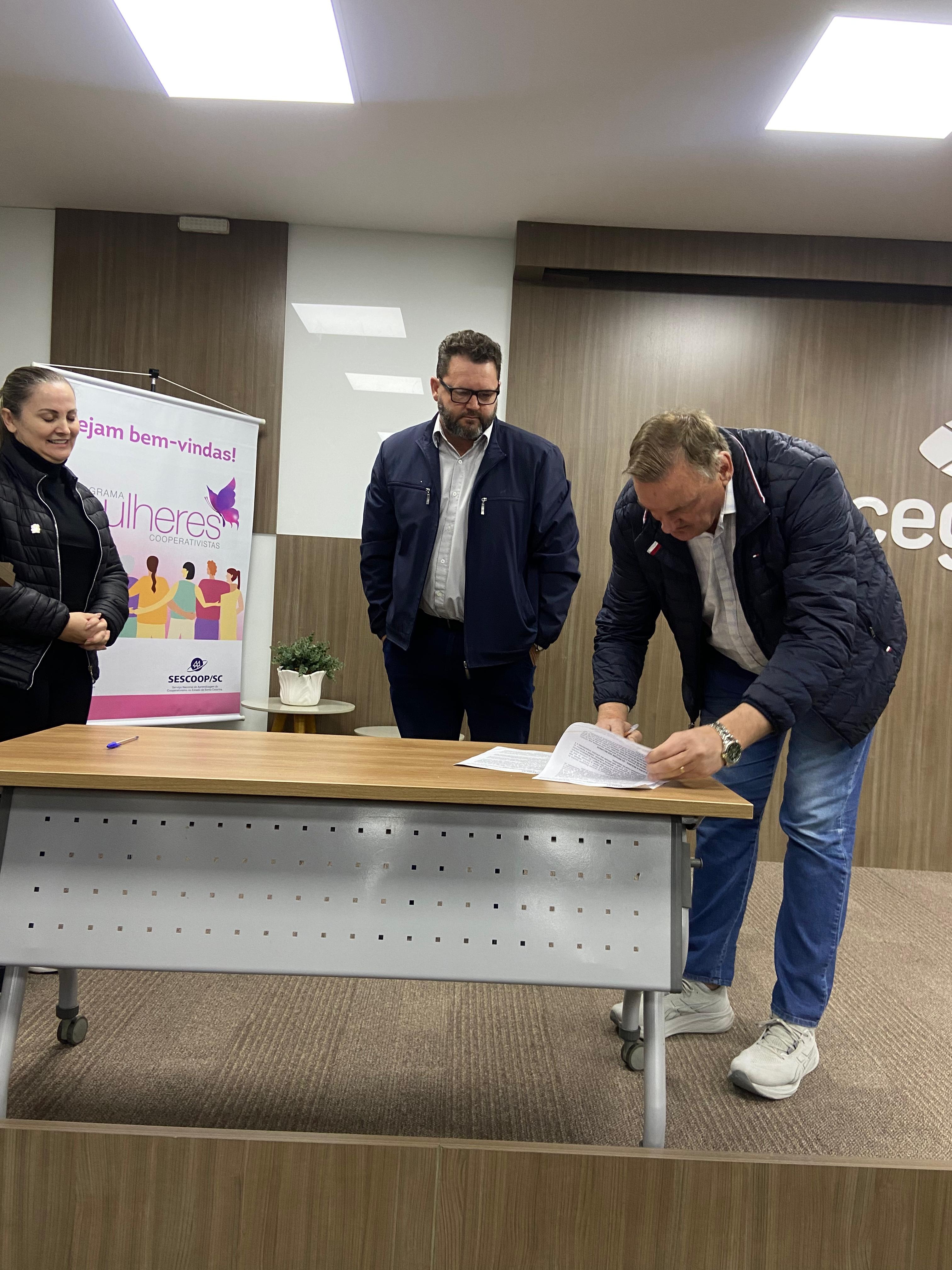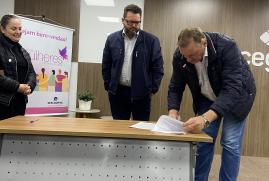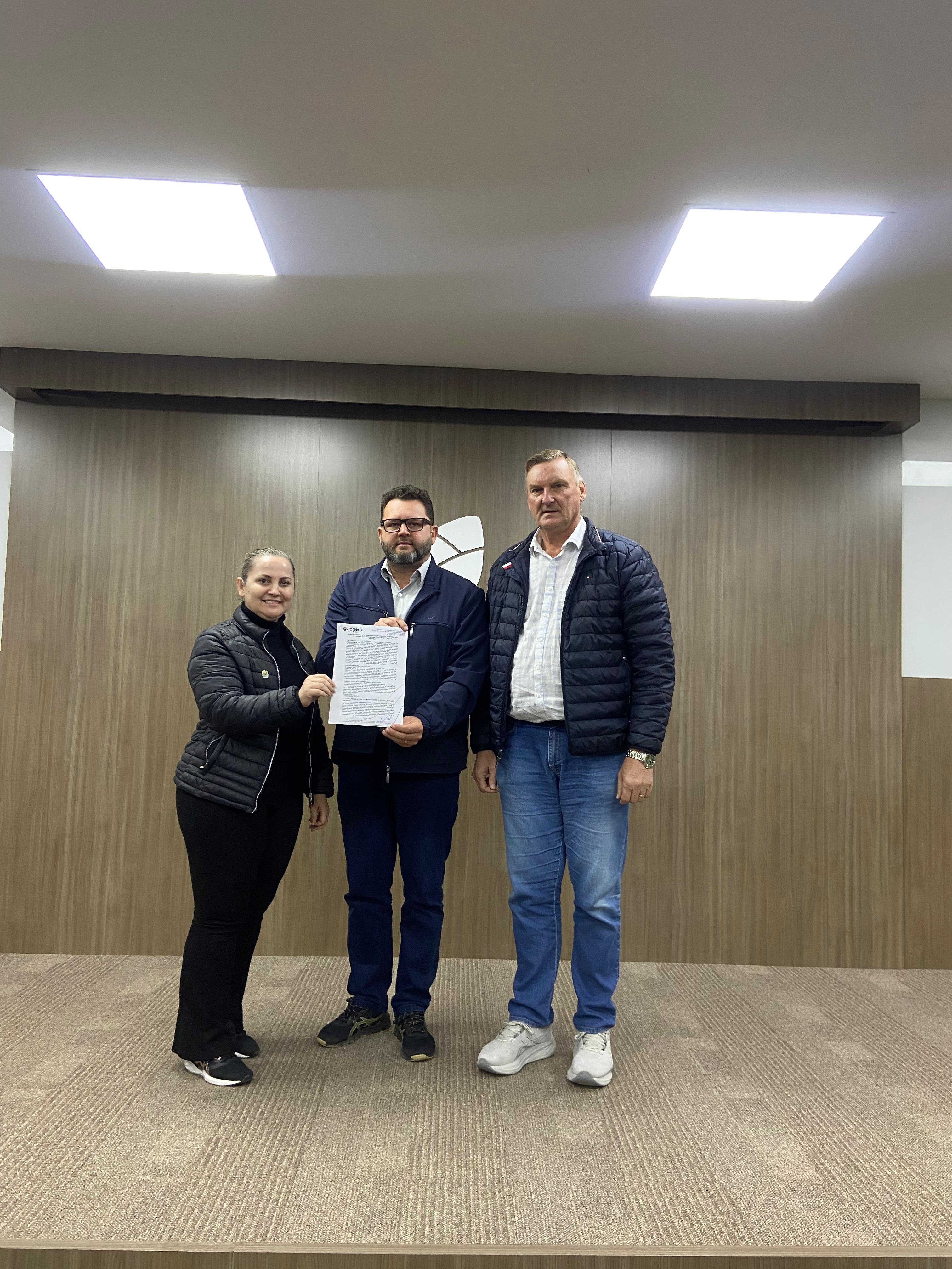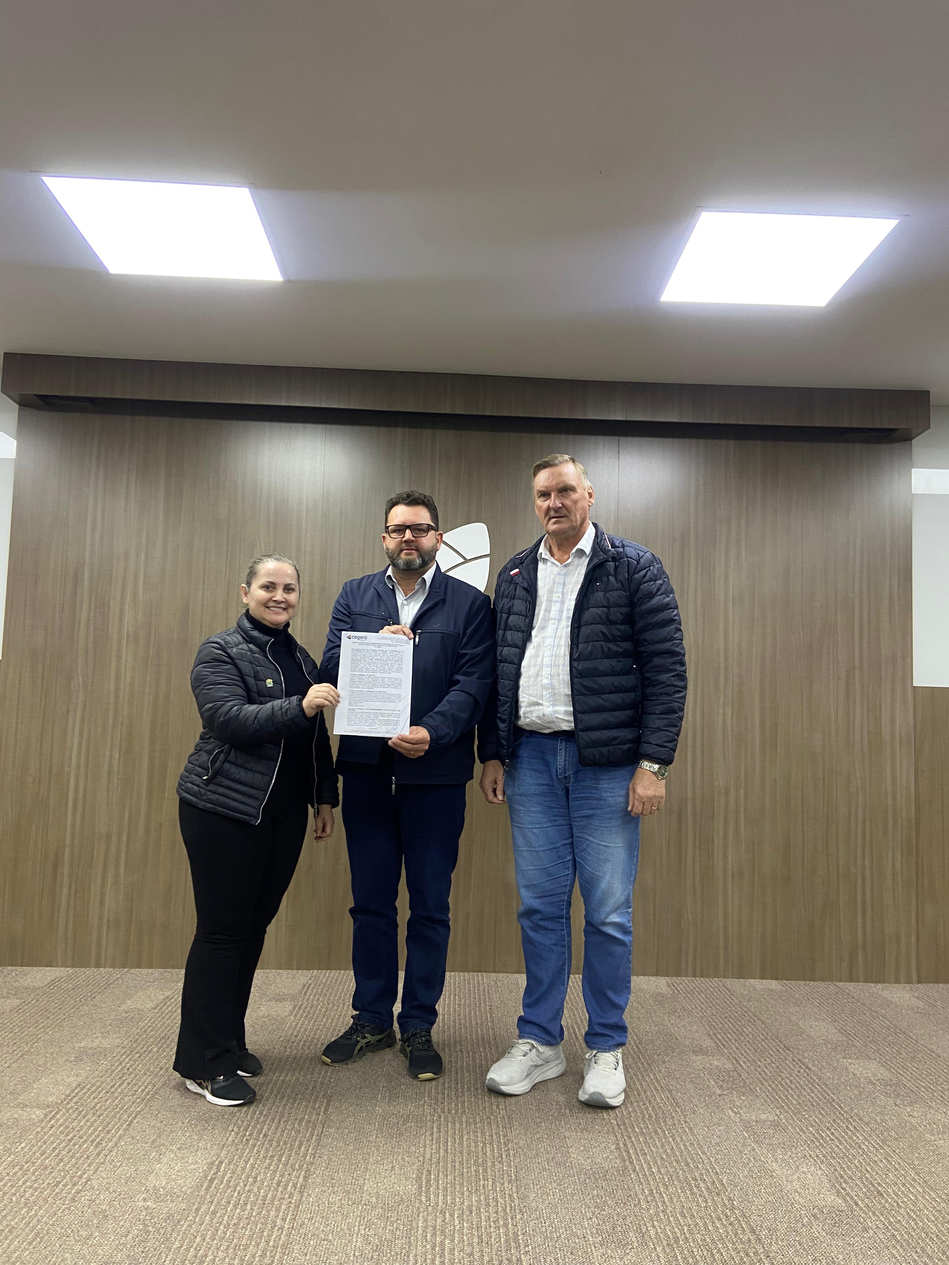 O ato de assinatura do termo de repasse contou com o presidente da Cegero, Tito Hobold, o presidente e a diretora da Apae, Silvio Schlickmann e Daniela Ouriques Nunes Vicente.