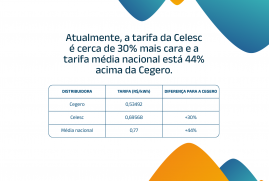 A Cooperativa de Eletricidade de São Ludgero (Cegero) possui atualmente a 3ª tarifa de energia elétrica mais barata do Brasil, entre 103 distribuidoras homologadas pela Agência Nacional de Energia Elétrica (ANEEL). A tarifa média nacional é 44% superior, e a Celesc cobra cerca de 30% a mais que a Cegero. Para entender o impacto disso no bolso, veja um exemplo prático: