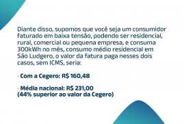 Caso um associado ou consumidor da Cegero em baixa tensão — seja residencial, rural, comercial ou de pequena empresa — consuma 300 kWh por mês, sem considerar o ICMS, ele economizará aproximadamente R$ 846,24 por ano em relação à média nacional.