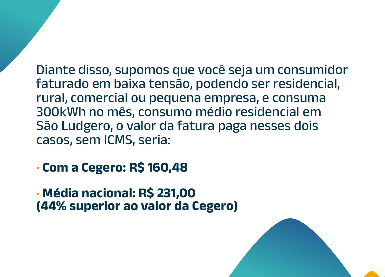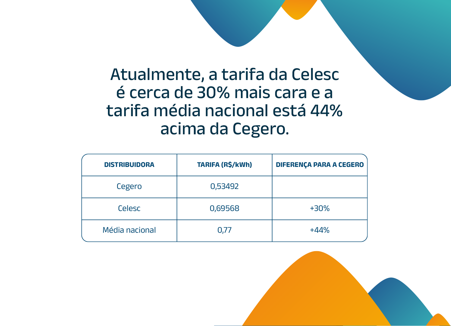 Enquanto na Cegero a fatura mensal seria de R$ 160,48, na média nacional chegaria a R$ 231,00 para o mesmo consumo. Já em comparação com a Celesc, cuja tarifa é cerca de 30% mais alta, o valor pago pelo consumidor seria de aproximadamente R$ 208,70, reforçando a vantagem econômica de ser atendido pela Cegero.