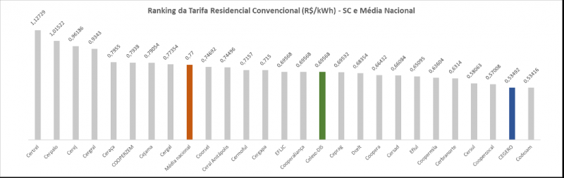 Atualmente, a tarifa da Celesc é cerca de 30% mais cara e a tarifa média nacional está 44% acima da Cegero.