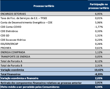 Para os consumidores faturados em Baixa Tensão, o efeito médio será de 0,71%, enquanto para os consumidores faturados em Alta Tensão será de 7,72%.
